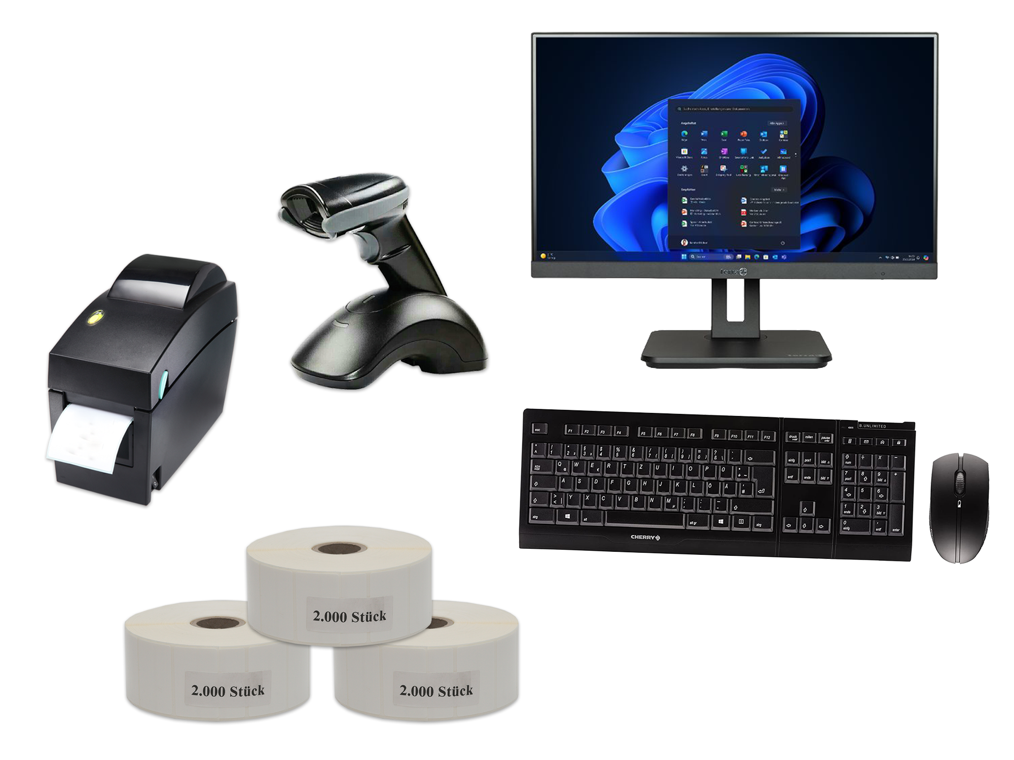 All-in-one-PC 24” Non-Touch, 2D Bluetooth Scanner Modell 5000 (schwarz), Funk Tastatur und Maus, Etiketten Drucker Label II